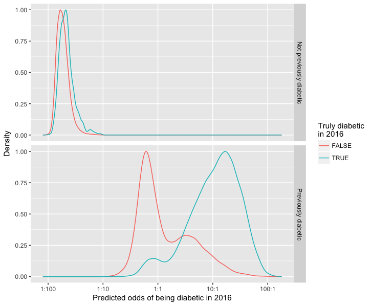 The most important predictor of buying diabetes drugs in 2016 was buying diabetes drugs prior to 2016. I split the data into two parts on this basis, and fitted glmnet models to each.