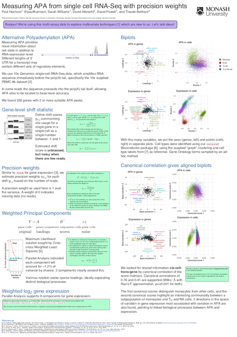 Poster for Lorne Genome conference 2019, looking at single cell data where each gene can produce two measurements: RNA expression level and choice of polyadenylation site. We're not exactly sure what the correct tools for analysing this data are yet, this poster is plays with weighted principal components and canonical correlation. I'm interested in expanding my use of multivariate techniques, there are whole histories of unfamiliar techniques, such as techniques from ecology and Exploratory Factor Analysis methods used in psychology and marketing. Apparently multivariate techniques are particularly popular in France.